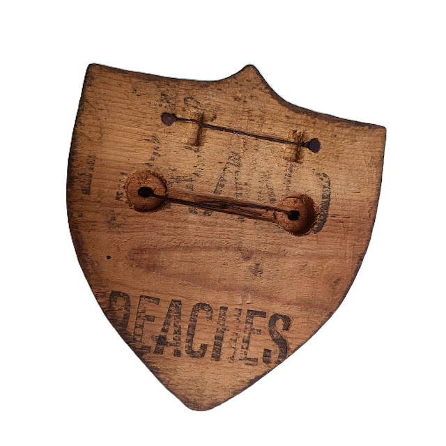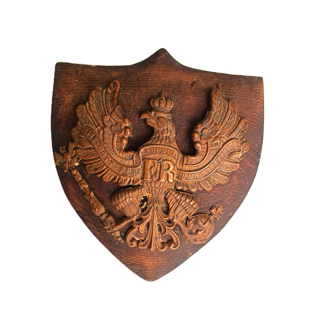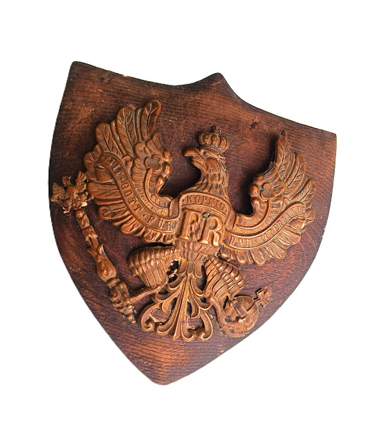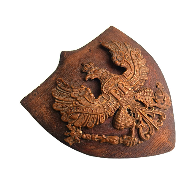 Plaque de casque en très bon état, utilisée en souvenir de la guerre( socle bois très ancien)